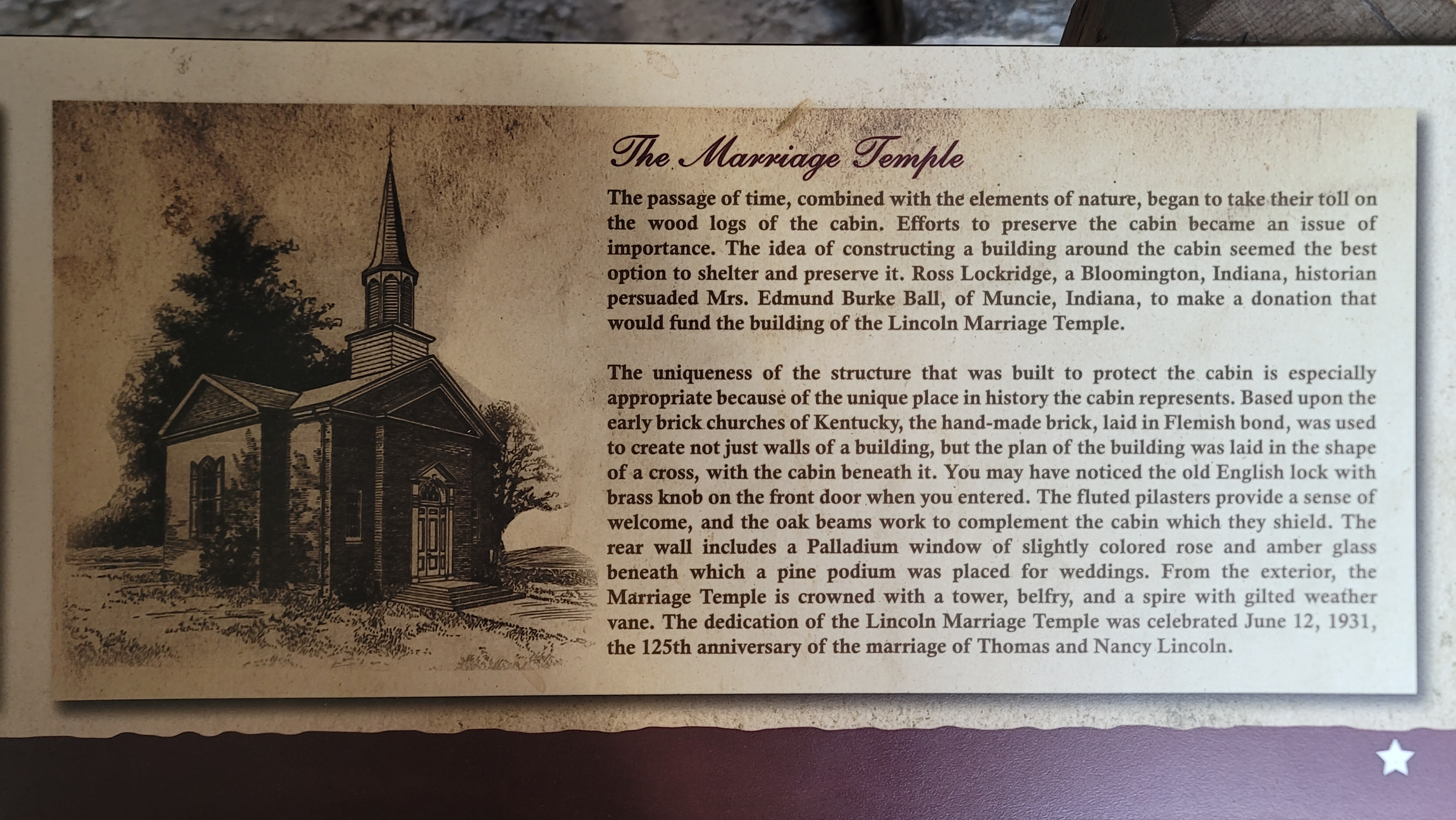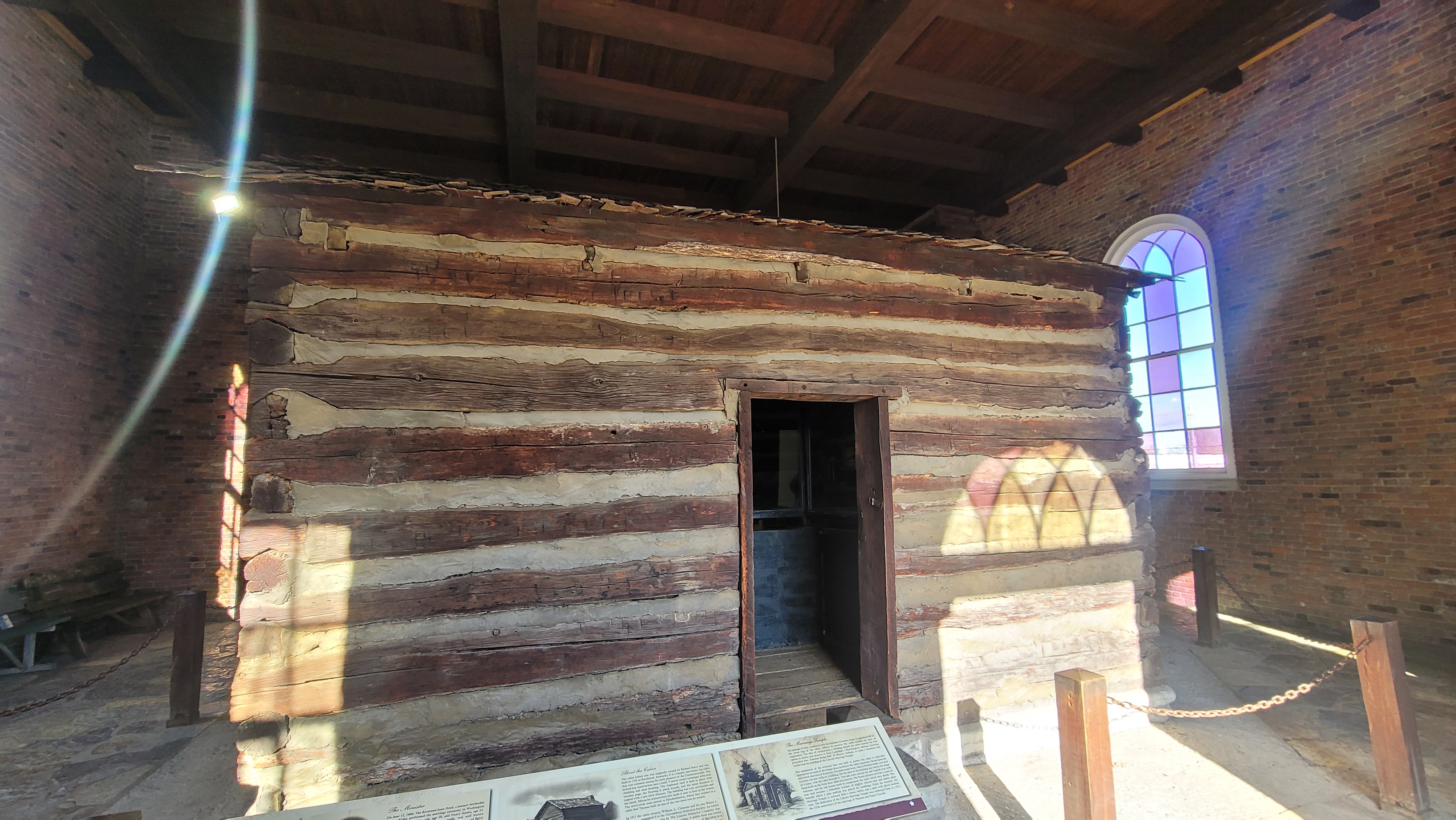 Though the Temple resembles a small church from the outside, its interior houses no pews or pulpit. Instead, it protects the historic marriage cabin itself, carefully relocated to Harrodsburg in 1913 and later enclosed within the Temple to safeguard it for future generations.